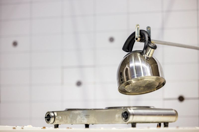The most important meal of the day - a full cooked breakfast, including coffee - prepared entirely by a pair of metal poles poked through a wall.